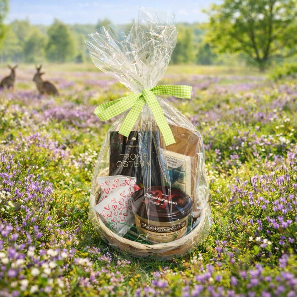 Dieser liebevoll zusammengestellte Oster-Präsentkorb vereint herzhafte und süße Spezialitäten aus der Region. Eine feine Hausmacher Leberwurst sorgt für den deftigen Genuss, während zwei kleine Tüten Fruchtgummis von der Bären Company fruchtige Freude bringen. Süße Highlights sind die handgemachte Heide-Crunch-Schokolade von YLVAS aus Soltau sowie die Schokolade mit Erdnüssen „Frohe Ostern“ von Feinkostina. Ein vielseitiger Genusskorb, der perfekt zu Ostern passt und kleine Genussmomente schenkt.